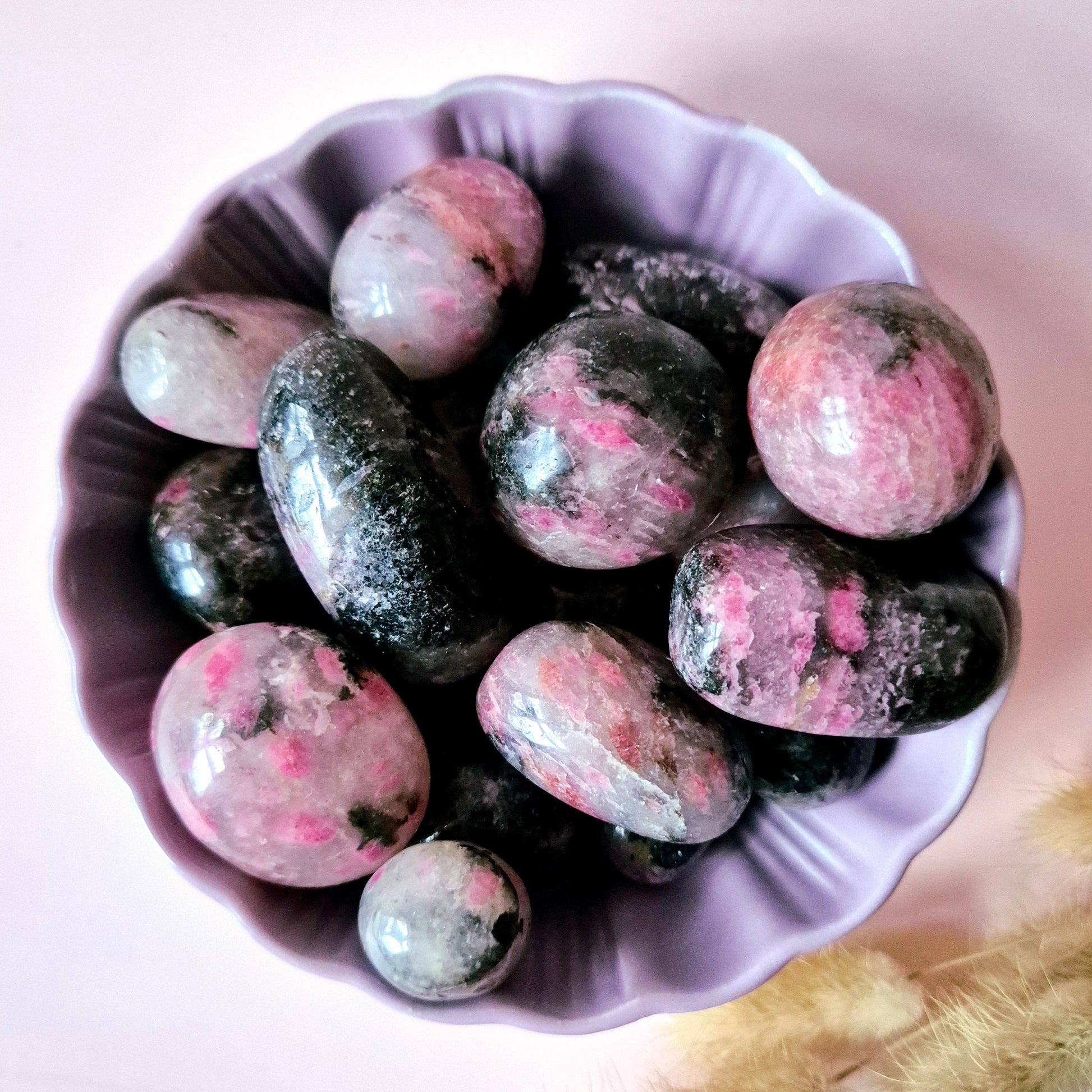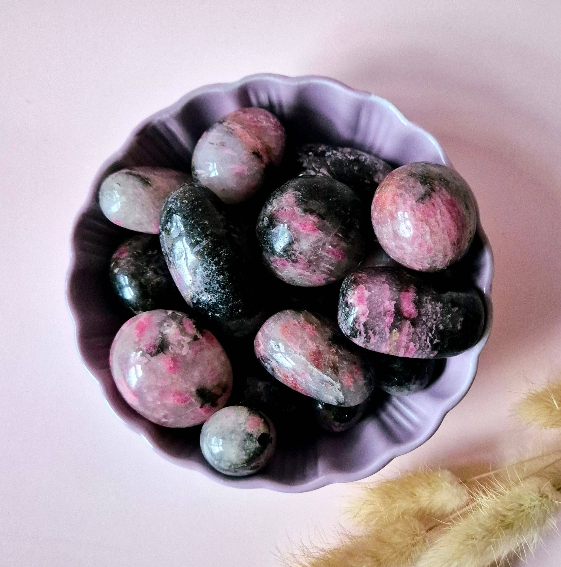 Rodonit av AAA-kvalitet är en exklusiv, högkvalitativ kristall känd för sina klara rosa toner med kontrasterande svarta inneslutningar. Upptäck den mjuka men kraftfulla energin hos rhodonit handstenar. Dessa vackra, slipade stenar bär rosa nyanser med naturliga svarta inneslutningar - visuellt starka och symboliskt djupa.