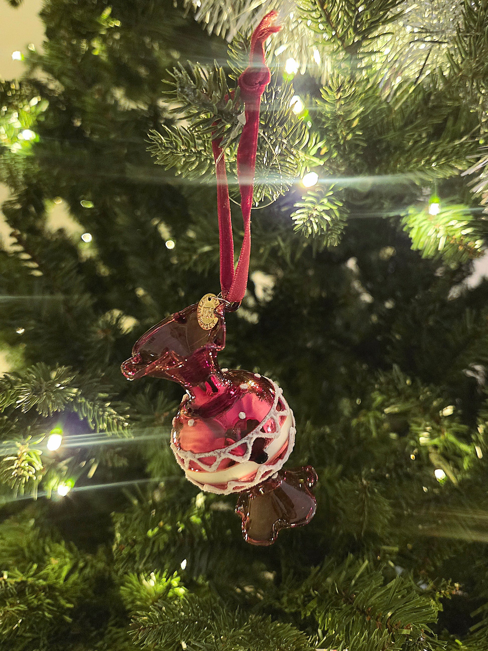 En elegant godisformad glasdekoration i djup rött med vit frostad detalj. Lyxig, söt och perfekt för dig som vill addera en glittrande karamellkänsla till granen.