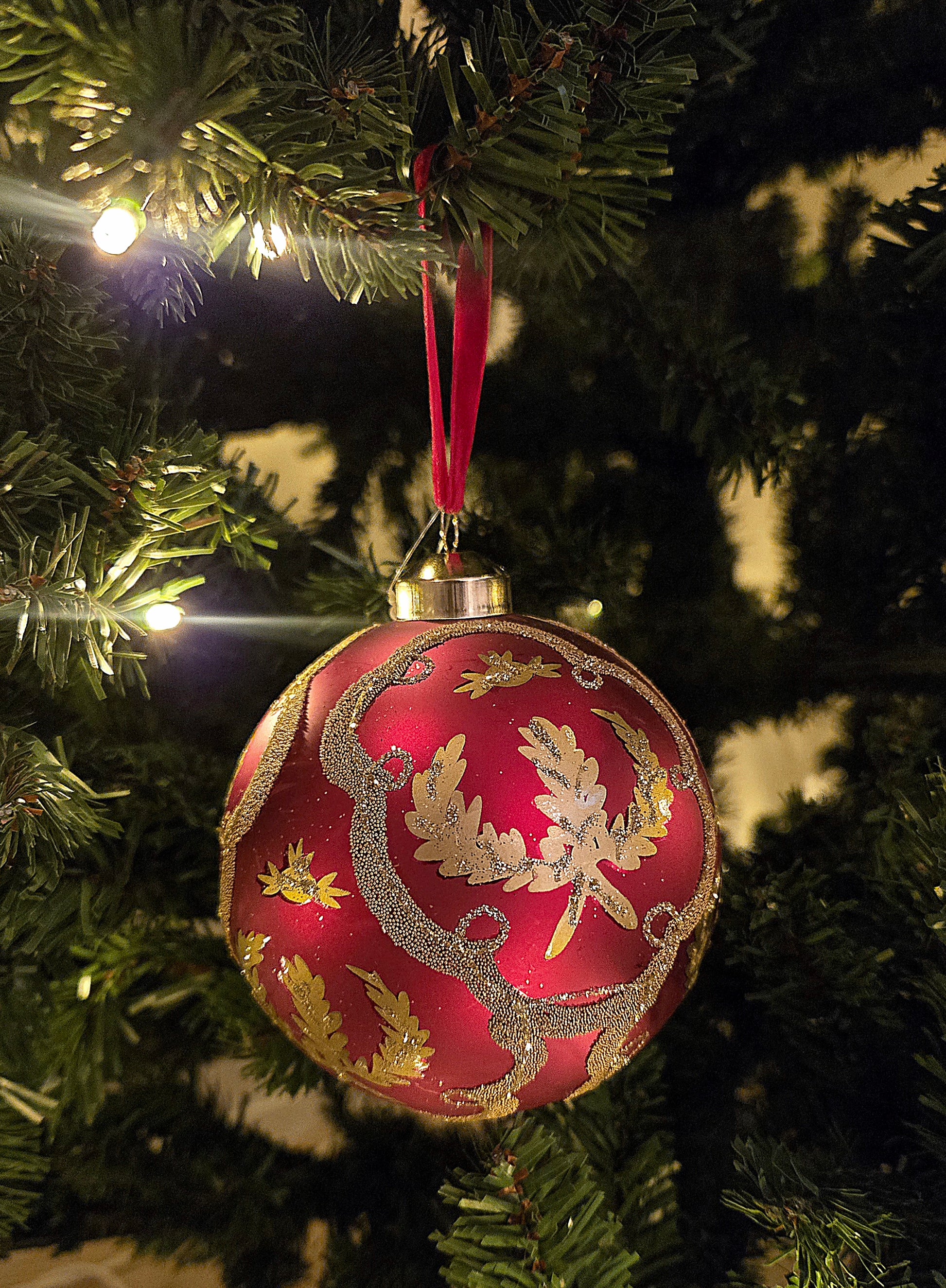 En elegant julkula i djup röd ton som fångar julens magi med sina vackra gyllene detaljer. Det dekorativa mönstret av blad och ornament ger en exklusiv och klassisk känsla — perfekt för dig som vill skapa en sofistikerad gran med traditionell charm.