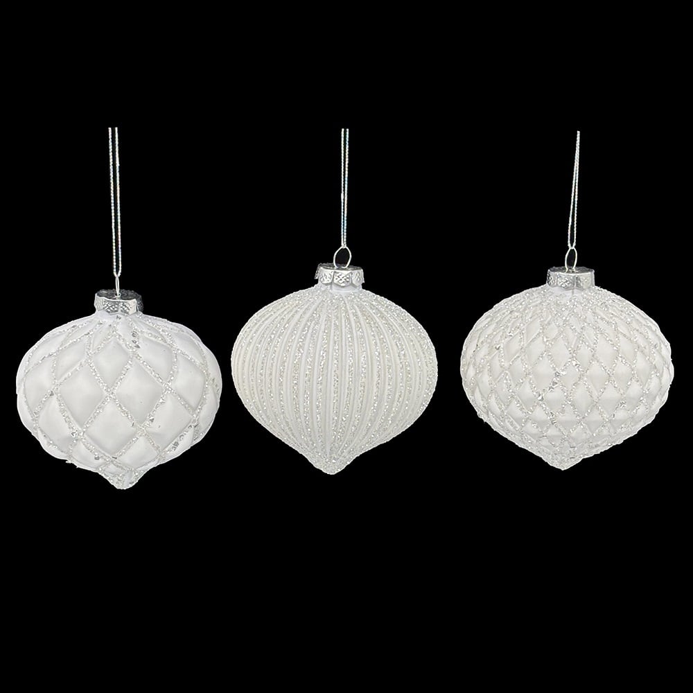 En vacker, droppformad kula i vitt med detaljerat rutmönster i glitter. Skapar ett mjukt och sofistikerat skimmer i granen.
