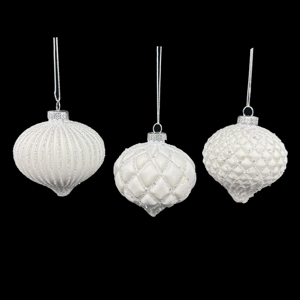 En elegant vit julgranskula med glittrande rutmönster. Ger granen ett stilrent och lyxigt uttryck.