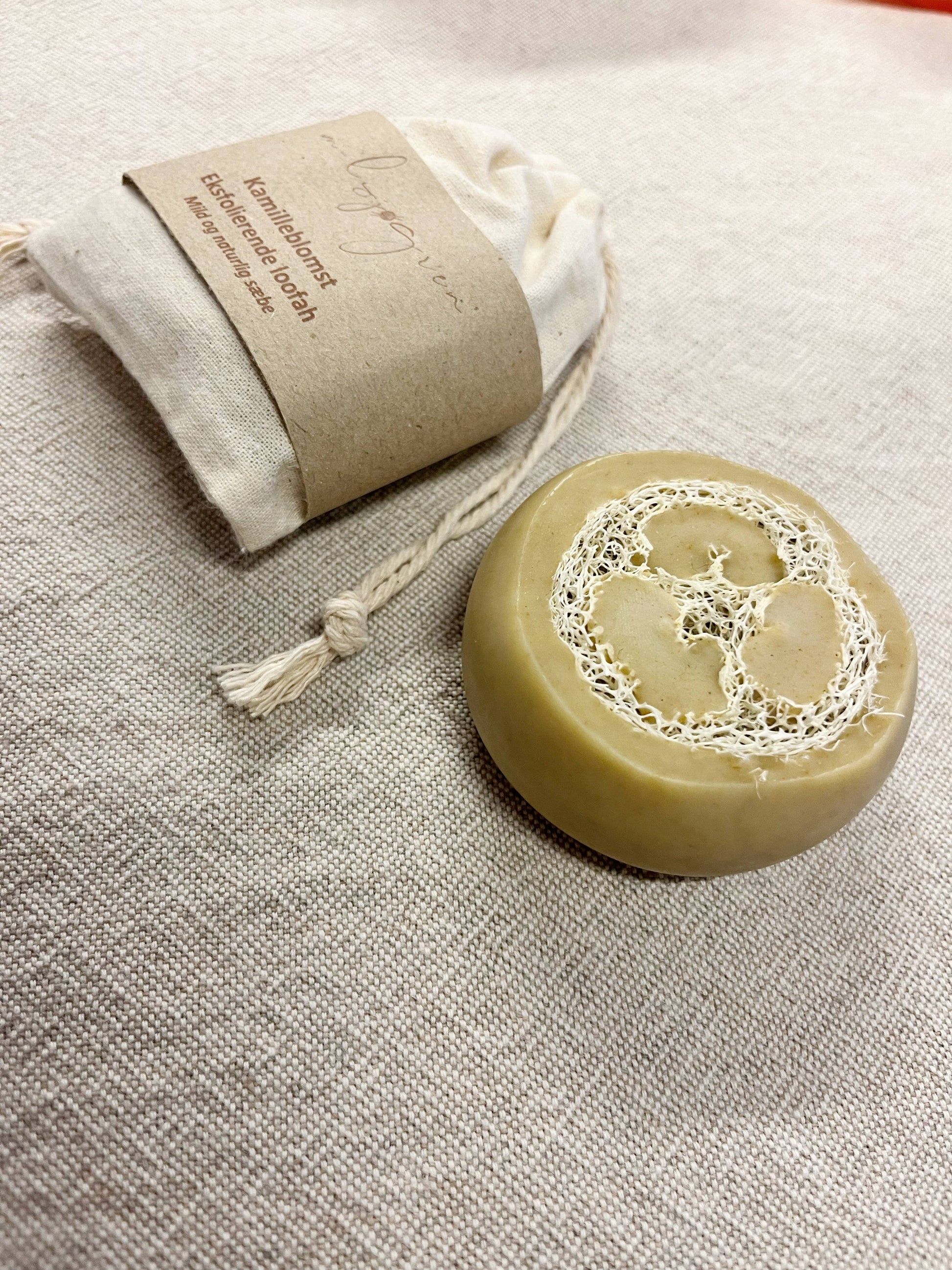 Tvålen innehåller en bit loofah, som är fantastisk för att exfoliera huden. Loofah är en klätterväxt och liknar en squash. Men när den torkas är den perfekt som naturlig skrubbsvamp. Tvålen är handgjord i små portioner med rena naturliga ingredienser. Därför kan små avvikelser i form och färg förekomma. Med denna tvålkaka undviker du också onödig kemi, överdosering och plastförpackning. Tvålen kommer nämligen i en liten återanvändbar påse, sydd i 100% bomull.