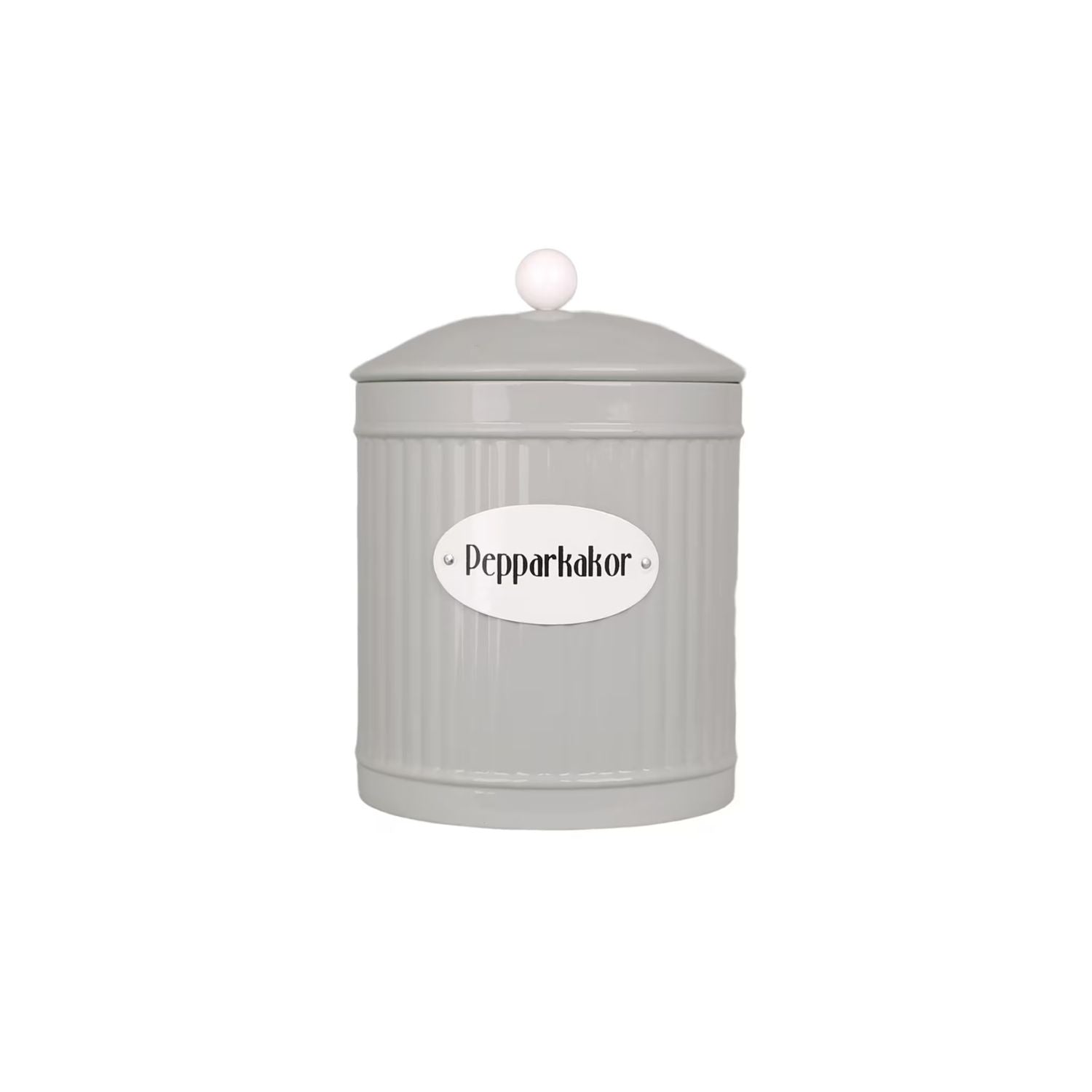 Rund plåtburk med lock med texten pepparkakor. Från plåtburksserien Hugo Beige.