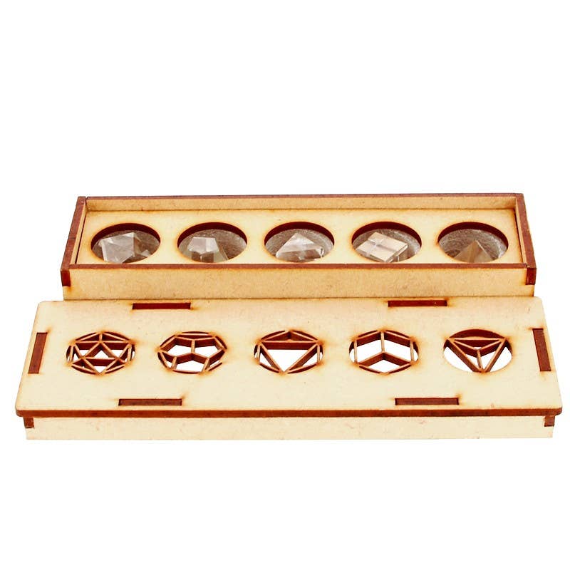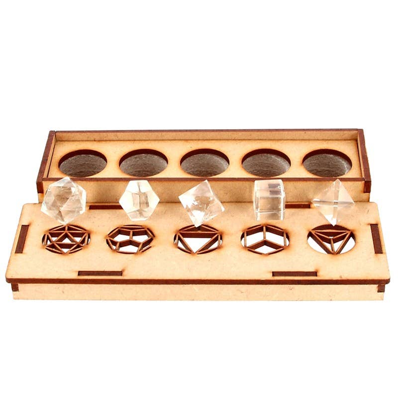 Ett exklusivt set med de fem platonska kropparna i extra klar bergskristall, vars former har studerats sedan antiken och betraktas som grundpelare inom helig geometri. Varje form är en perfekt regelbunden polyeder - lika långa kanter, identiska vinklar och exakt lika stora ytor.