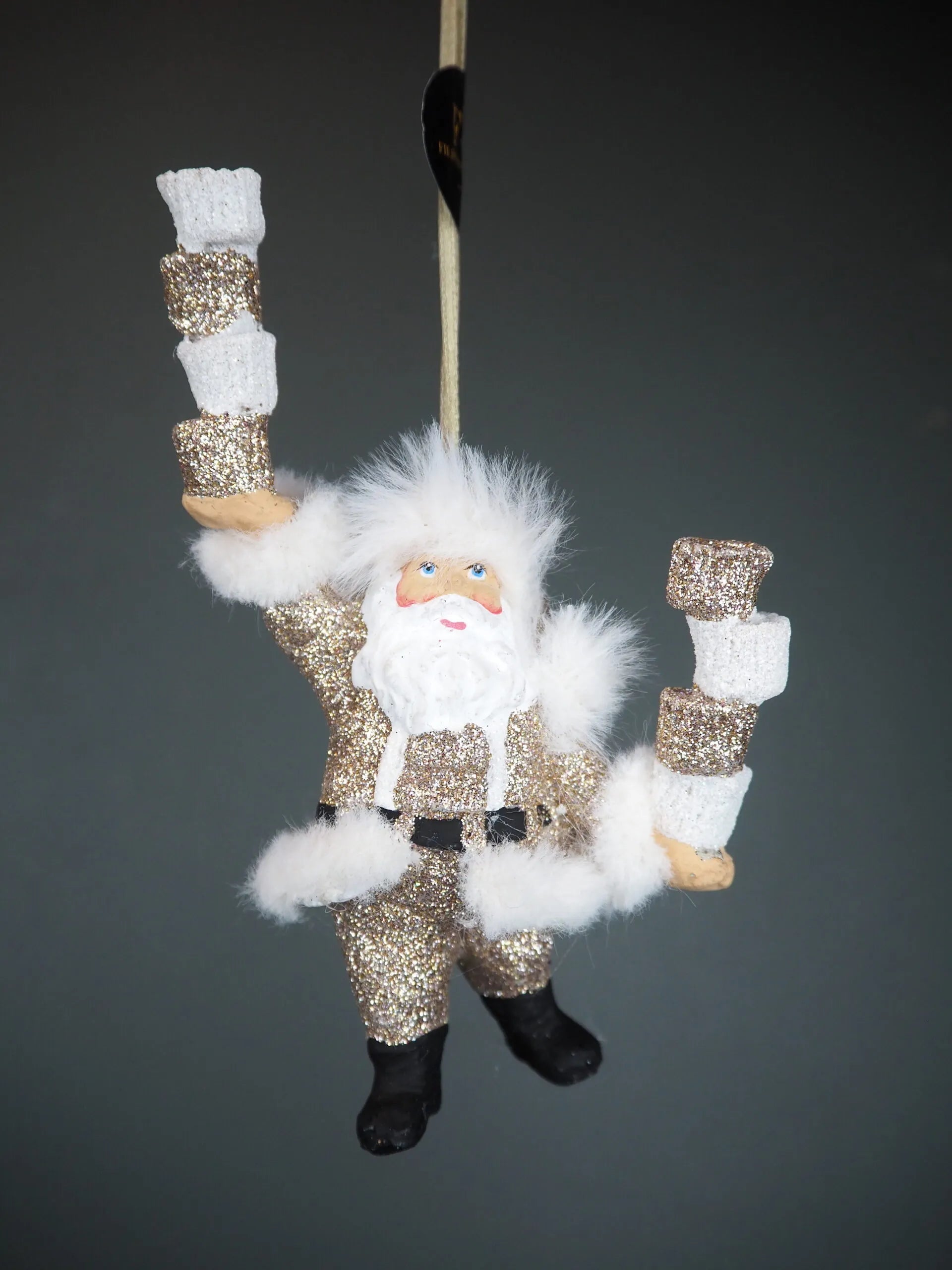 En lekfull tomte som sträcker sig mot julens magi! Klädd i gnistrande guld med fluffiga detaljer och höga paket i handen blir detta hängande ornament en glittrande favorit i granen.